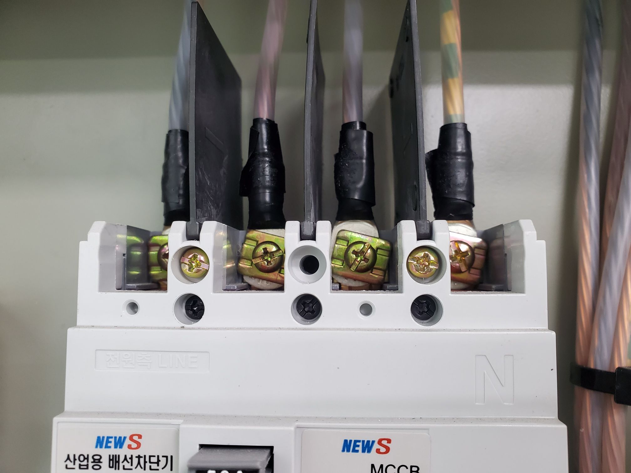 전선에 터미널를 연결하여 차단기에 설치한 모습입니다.